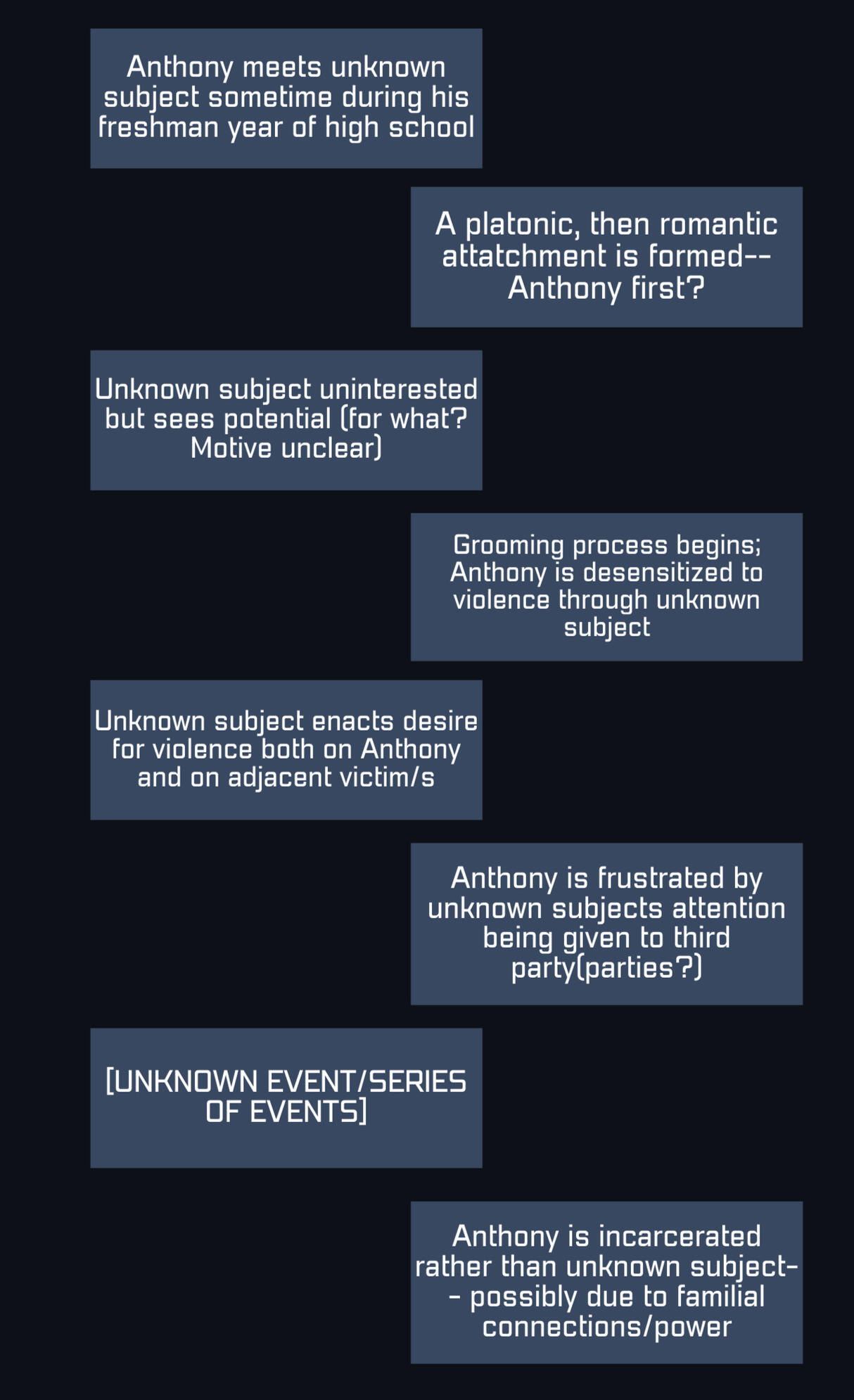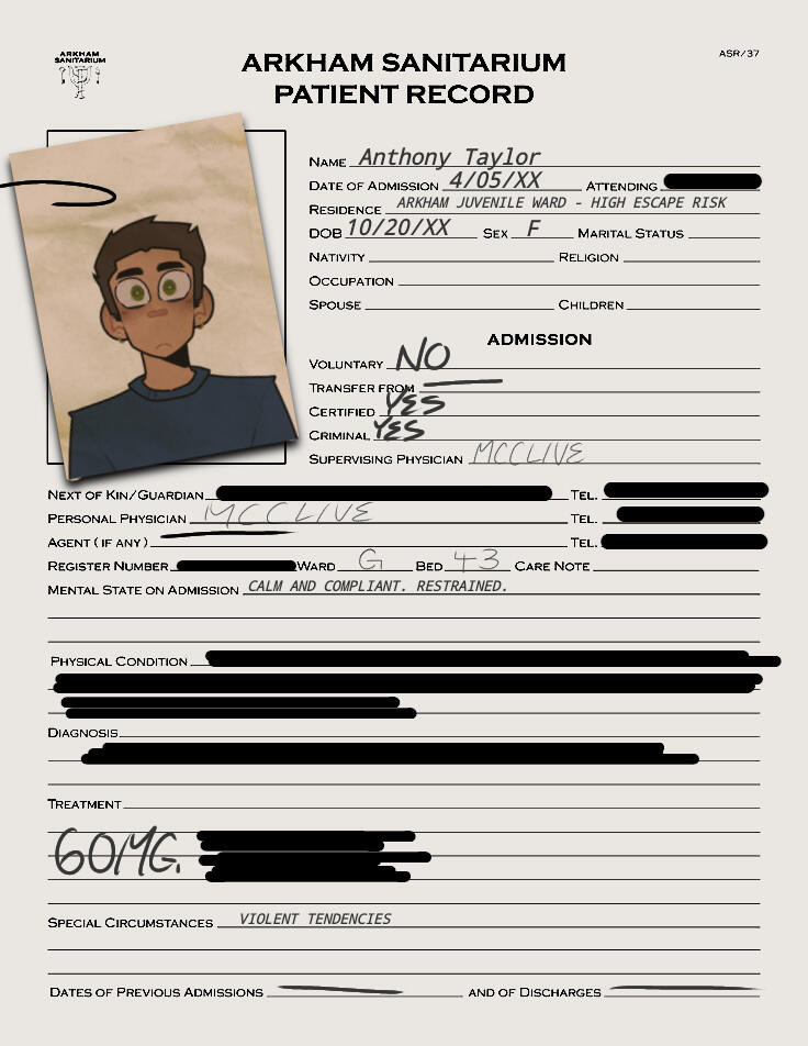 Anthony Taylor (OPERATIVE NAME: NIGHTINGALE) began a 'romantic' relationship with Lucien Arkham sometime in XXXX. Anthony was 16, Lucien was 18. Upon beginning this relationship, Anthony was unaware that Lucien had a long history of violence stretching back to early childhood and had largely avoided punishment through his family's influence as well as his own charisma. Over the course of their relationship, Lucien became increasingly physically, emotionally, and verbally abusive, ultimately sending Anthony into what was possibly a manic episode (details unclear-- physicians' notes inconsistent and most likely inaccurate). In a fit of rage, Anthony lashed out at a peer he knew in his high school-- one of the girls who Lucien had been seeing at the same time as he'd been with Anthony-- and threatened her, ultimately leading to his arrest and incarceration in Arkham Asylum for one week in the spring of XXXX. It is suspected that Lucien's family (more specifically, his uncle, Jerimiah Arkham, who has been the director of Arkham Asylum since XXXX) most likely influenced the police and school administration to shift the situation and align with their claim that Lucien had done no wrong.NOTES: