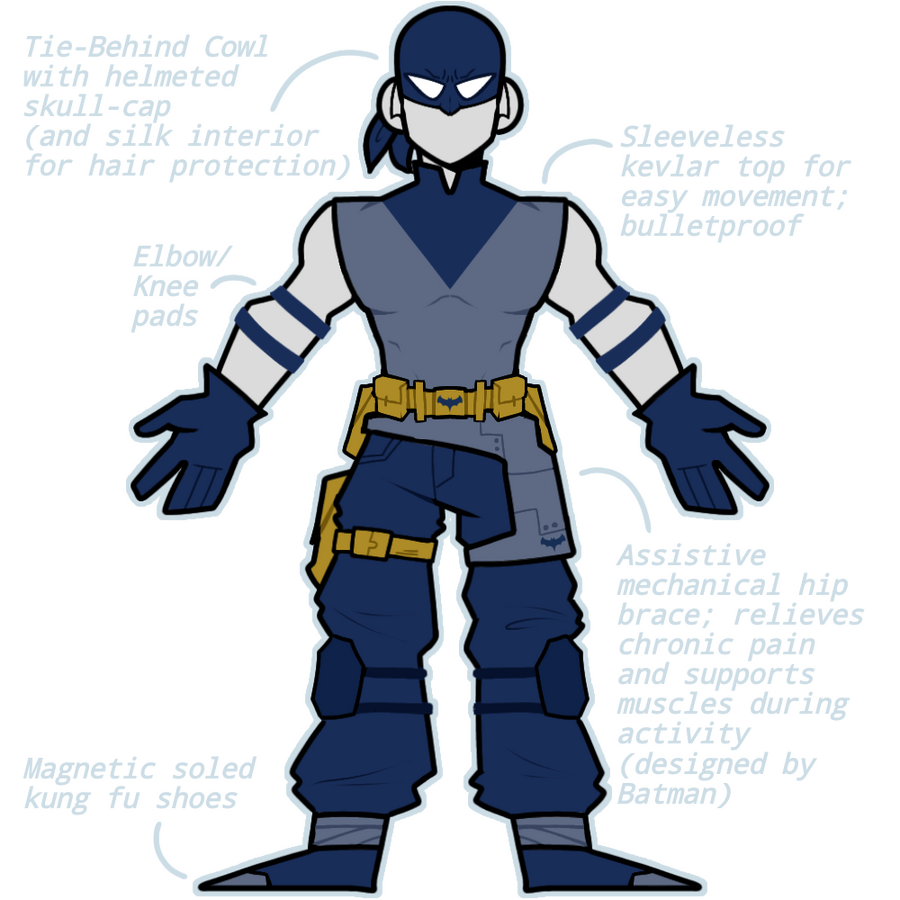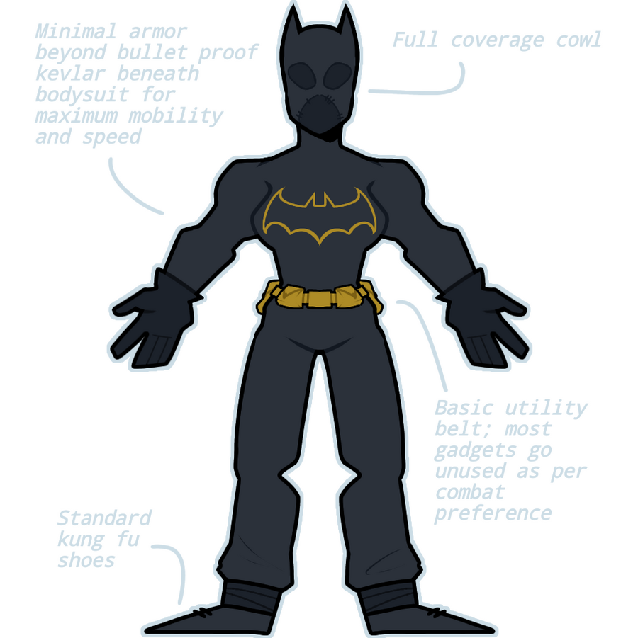 HAND-TO-HAND: 10/10PRIMARY SKILLS: Martial Arts, Advanced Stealth, CQC, Disarm and Disable Techniques, Submission control, Striking SystemsSECONDARY SKILLS: Precision Range Attacks, Acrobatics, Multi-Opponent Engagement, Crowd ControlFIELD WEAKNESSES: Somewhat compromised field judgement when allies and/or civilians are at risk, somewhat predictable techniques due to well-known moral codes around combat. Willing to allow suspects to escape in exchange for saving lives.WEAPON PROFICIENCIES: Capable and skilled with any.NOTES: A master of over 127 different global styles of martial arts, he is considered one of the greatest fighters on the planet. Though he lacks a specific specialty in the way that many other members of the Batfamily do, he is a remarkable jack-of-all-trades.
